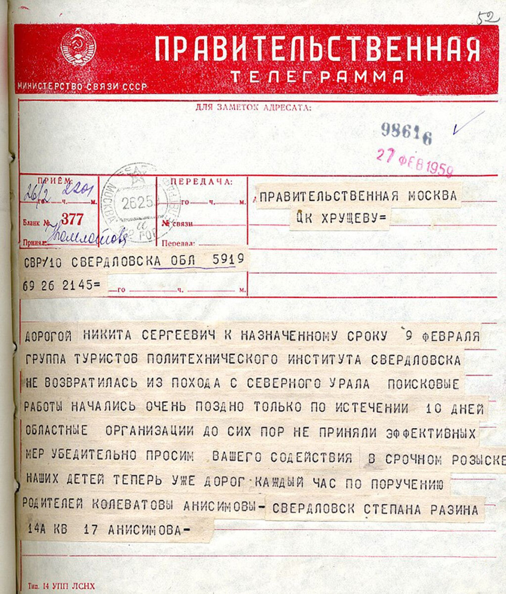 «Дорогой Никита Сергеевич! К назначенному сроку 9 февраля группа туристов политехнического института Свердловска не возвратилась из похода с Северного Урала. Поисковые работы начались поздно, только по истечении 10 дней. Областные организации до сих пор не приняли эффективных мер. Убедительно просим Вашего содействия в срочном розыске наших детей. Теперь уже дорог каждый час».