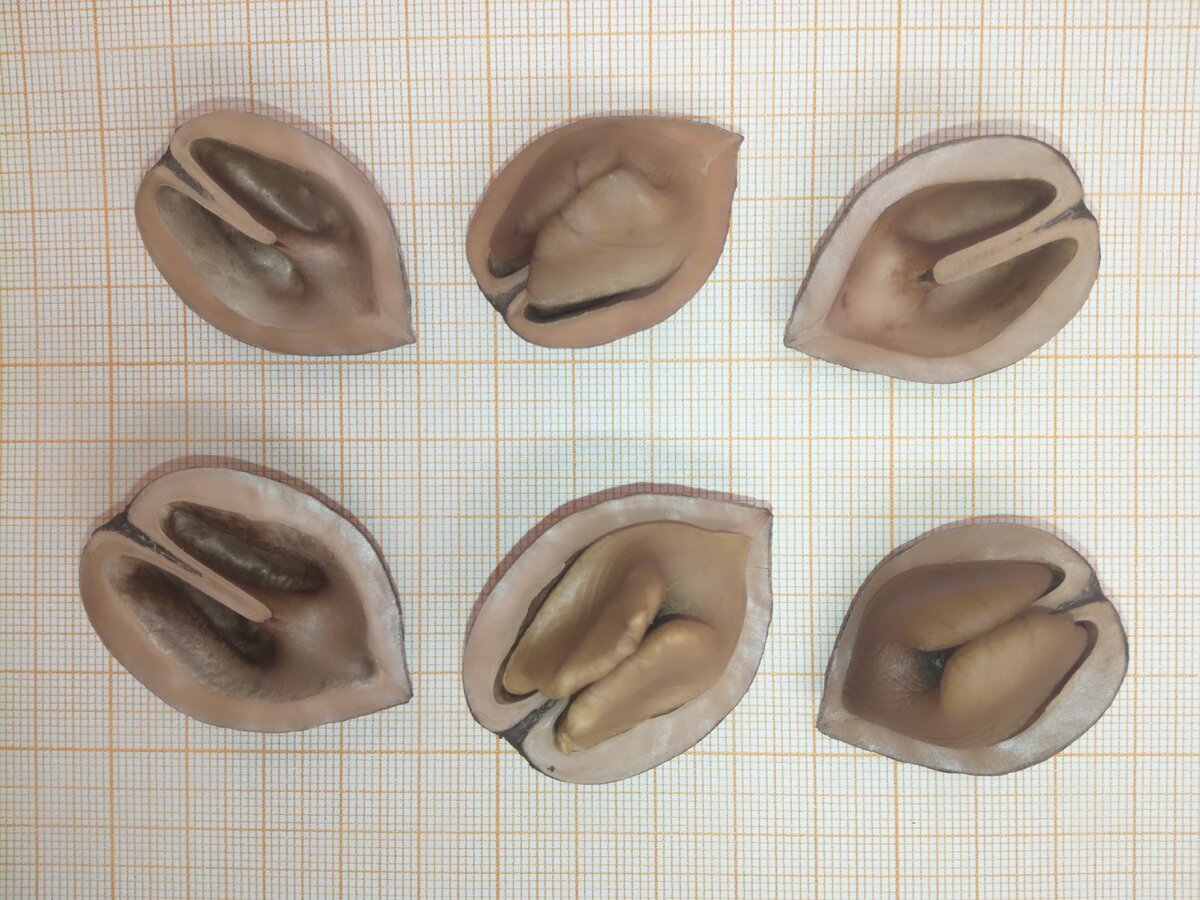 Конкретно у ореха, изображенного на фото вес ядер составил 2,72; 2,79; 3,12 гр. (среднее 2,88 гр.). При этом вес самих орехов соответственно 9,44; 8,28; 11,55 гр. (среднее 9,76 гр.) Другими словами, средний выход ядра составил 30%.