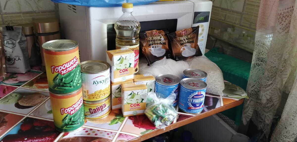Вот такой сухой паек выдают ученикам в Пермском крае. Напомню, выдают его раз в 2 недели (10 рабочих дней), из расчетарасчёта стоимости 96 рублей в день. Что туда входит? Не видно, но в оддномодном из пакетов крупа ячневая, примерно 1 кг. Во втором примерно столько же сахару. 3 банки сгущёнки (не сгущённого молока, отличие в содержании растительных жиров). Бутылка подсолнечного масла. 4 маленьких пакета сока. 2 упаковки какао порошка. 1 банка сайры консервированной. 1 банка кукурузы и 2 банки зеленогозелёного горошка. Не буду ничего говорить о стоимости набора, но не кажется ли вам, что такой набор продуктов не совсем подходит для учеников начальной школы?