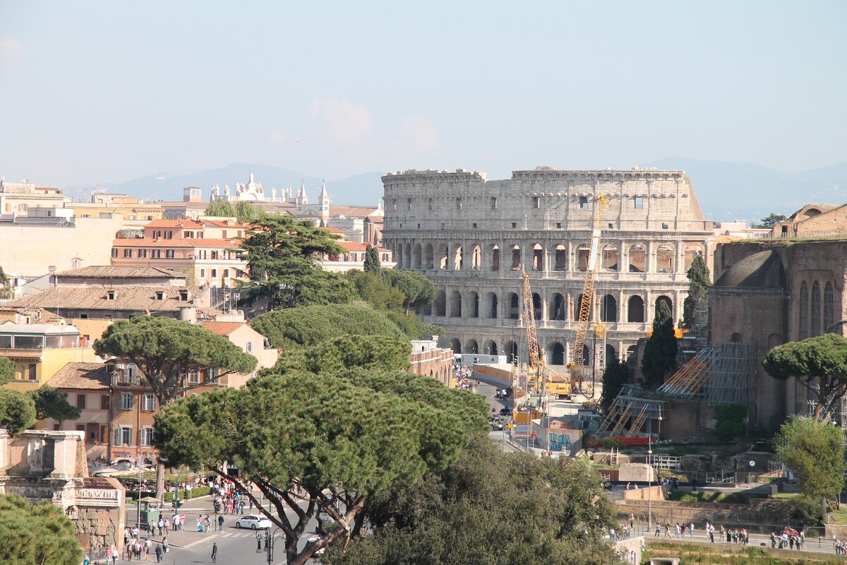 В этой статье не будет нудных иторических сведений из википедии. Просто прогуляемся по улицам Рима и посмотрим на самые интересные памятники архитектуры разных эпох. Начнем с одного из символов Рима - Коллизея: Очередь на вход впечатляет: Внутри Коллизей выглядет так: Рядом с Коллизеем находится Арка Константина: Арка сохранила свой античный образ: Далее заберемся на Паллатинский холм: Холм является смотровой площадкой с великолепным обзором на Римский Форум: В этом месте возник Рим и зарождалась его государственность: Далее поднимемся еще на одну смотровую площадку - Алтарь Отечества: Это памятник архитектуры 20 века, построенный по приказу самого Муссолини. Виды со смотровой: Проследуем к соседней Площади Республики: Далее выходим на набережную реки Тибр: И по мосту Святого Ангела: фото моста выходим к одноменному замку: На вершине замка устроена смотровая площадка с великолепными видами. Собор Святого Петра в представлении не нуждается: Находится на территории уже другого госуд