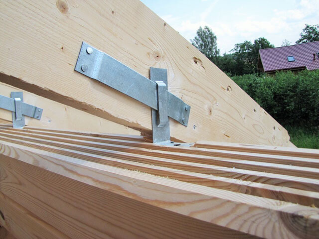 - Сборка стропильной системы, обрешетки. Для закрепления стропил в верхних венцах бруса еще на производстве вырезаются пазы. Монтаж происходит при помощи усиленных уголков и скользящих креплений.