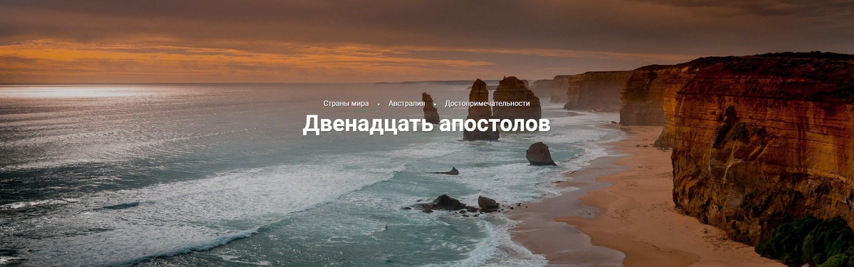 Двенадцать апостолов (The Twelve Apostles) Двенадцать апостолов — группа известняковых скал у побережья Национального парка Порт-Кэмпбелл. Скалы являются одной из главных достопримечательностей Великой океанской дороги. Ежегодно 12 апостолов посещают более 2 млн туристов, среди которых много профессиональных фотографов. И это не случайно. Можно часами наблюдать, как удивительно и неповторимо скалы меняют свой цвет в зависимости от освещения. Самые эффектные виды открываются на рассвете и закате, когда солнечные лучи окрашивают побережье и скалы яркими красками, а затем всё погружается в сумерки. А в спокойные солнечные дни Двенадцать апостолов становятся великолепными памятниками песочного цвета. История и путешествие Возраст скал составляет около 20 млн лет. “Апостолы” были образованы эрозией: ветер и волны постепенно размыли мягкий известняк, образуя пещеры в утесах, которые затем превратились в арки, а те, в свою очередь, рухнули, оставив после себя скалы высотой до 45 метров. У