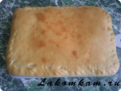 Берем готовое тесто, раскатываем в пласт толщиной 1 сантиметр, укладываем тесто на противень, сверху раскладываем ровным слоем начинку, нарываем другим пластом, защипываем края и ставим в духовку на 30 минут.