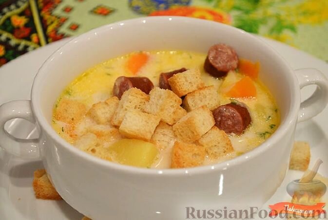 Добрый день дорогие читатели хочу рассказать как готовить сырный суп быстро и вкусно) Сырный суп один из разновидностей первого блюда. Готовится быстро и довольно вкусно) Нам понадобятся: И так все ингредиенты есть, начнём. Овощи почистить и нарезать, в казане пожарить чеснок на растительном масле несколько секунд. Сразу добавить лук и морковь жарить до прозрачности. Добавить колбасу жарить несколько минут. Добавить картофель, жарить 10 мин помешивая, добавить соль по вкусу) Залить в казан воду и варить суп с колбаска и и овощами в течении 15 мин. До готовности картофеля. Натераем сыр на тёрке и Добавляем в суп, мешаем до полного растворения сыра. Сырный суп подавать с сухариками. Приятного аппетита вам, если нравятся наши рецепты ставьте лайк и Подписывайся на канал у нас много рецептов)
