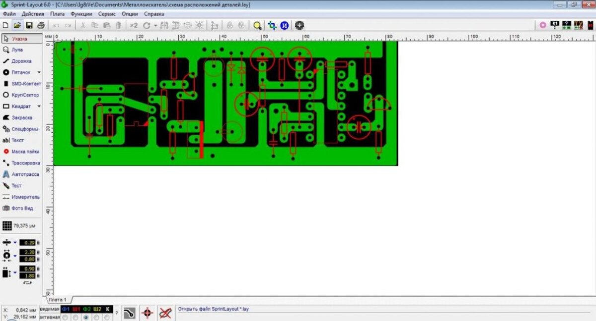 Первоначально по ссылке СКАЧАТЬ загружаем архив с программой Sprint-Layout 6.0, списком необходимых радиодеталей и схемой их расположения на плате.