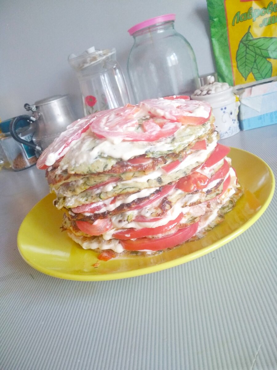 1...Кабачки чистим и натираем на крупной терке, солим, Оставляем кабачки на 15 минут, чтобы они дали сок. 2... За это время нарезаем помидоры кружочками, а в майонез добавляем пропущенный через пресс чеснок. Май. Он гораздо полезнее магазинного. 3.. Сок с кабачков можно слить просто прижимая кабачковую массу руками, а можно кабачки откинуть на дуршлаг, и, слегка утрамбовывая, выдавливать жидкость. 4.. В кабачковую массу вбиваем яйца, добавляем мелко нарезанный укроп, солим и перчим. Все хорошо размешиваем. 5. Постепенно всыпаем муку. Тесто не должно быть жидким, иначе коржи при переворачивании расползутся. 6. Выпекаем на разогретой сковороде, смазанной растительным маслом, блины. Количество коржей будет зависеть от их диаметра. С указанного в рецепте количества должно получиться 4-5 коржей. 7. Блины обжариваем с двух сторон до красивой золотистой корочки. Коржи оставляем в сторону до полного остывания. 8. Складываем кабачковый торт. Первый корж из кабачков смазываем майонезом, а наве