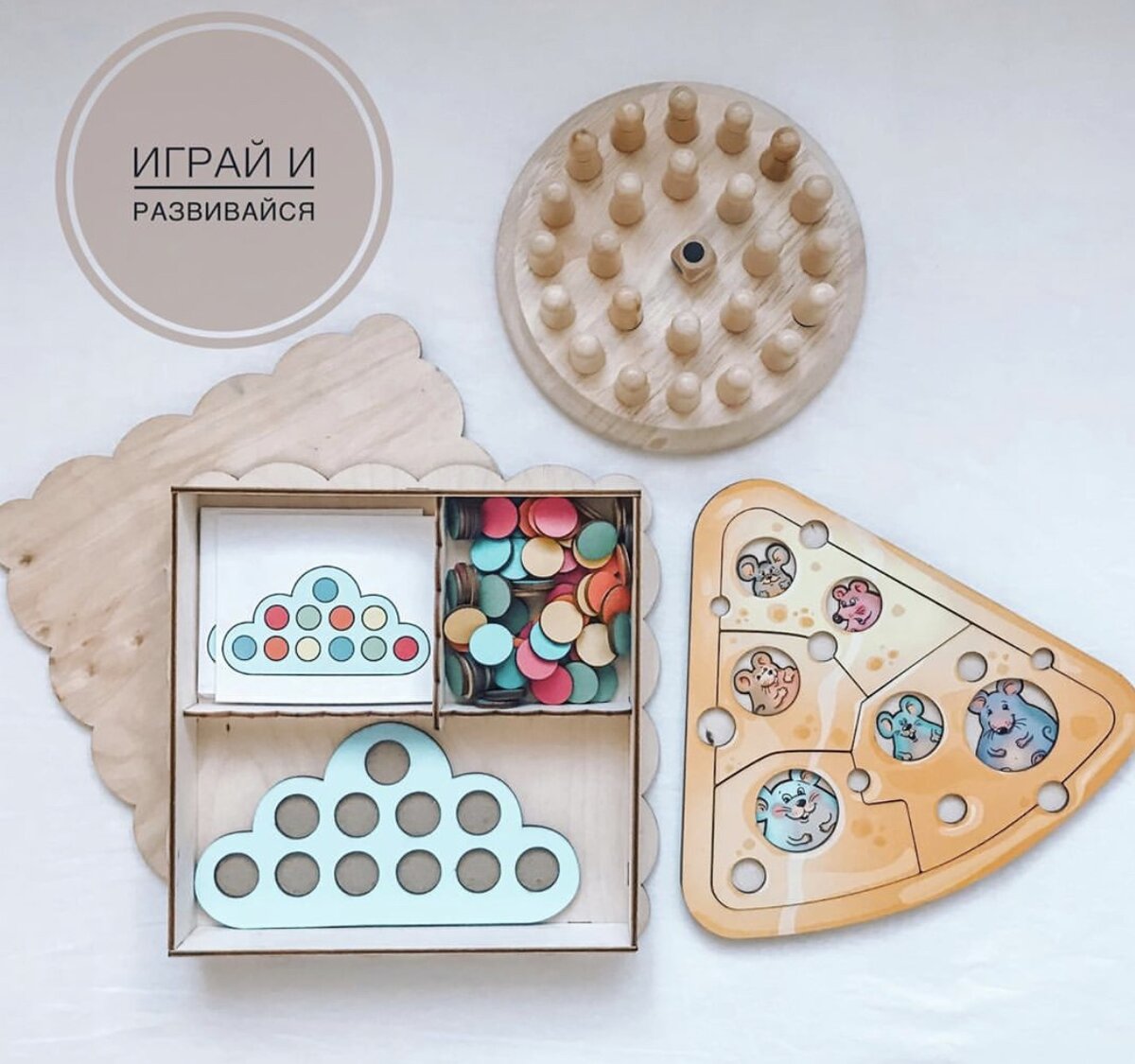 3. Головоломка Сыр. Отличный деревянный пазл 🧩 Качество-цена просто на высшем уровне! По мимо цвет/форма, можно изучать эмоции, ведь у всех мышат они разные ☝🏻Так же, можно предложить расположить их по величине от большего к меньшему; обвести мышек и кружки в сыре на бумаге, а потом раскрасить; создать свои уникальные картины и дать роли каждому мышонку, обращая внимание на его настроение 😊