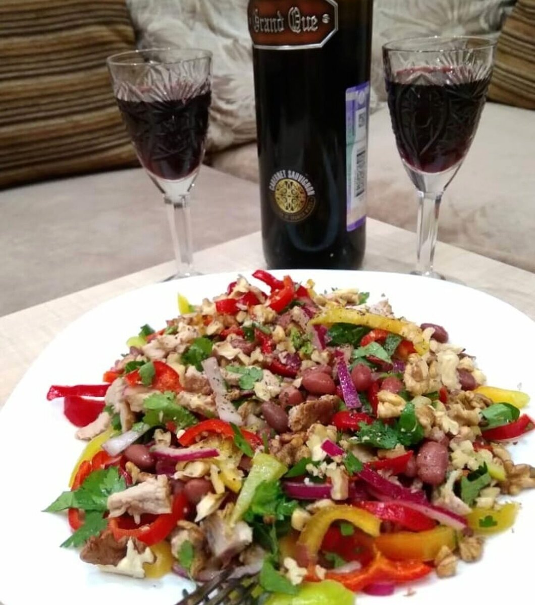 Салат "Тбилиси" - это буйство вкусов! Этот салат также прекрасен, как и сам Тбилиси - яркий, колоритный, вкусный, основательный, душевный, с нотками кавказского гостеприимства! НАДО: -отварная говядина - примерно 300 грамм; -баночка красной консервированной фасоли; -перец болгарский - 1-2 шт; -красный лучок - 1 небольшая головка; -кинза - пучок ; -орехи грецкие - штучек 12, можно больше))); -соль, перец - по вкусу; -чеснок - 1-2 зубчика; -хмели-сунели - 1ч.л.; -масло для заправки. ДЕЛАЕМ: 1. Отварную говядину и болгарский перец нарезаем полосочками, лук - полукольцами 2. Кинзу рубими. Чеснок попускаем через чеснокодавку или мелко рубим.Грецкие орехи колотим. и чуть обжариваем. Я их не измельчаю. Добавляю крупными - половинками, четвертинками. Как получилось расколотить, такие и добавляю)) 3. Перемешиваем наши ингредиенты, добавляем соль, перчик и заправляем маслом. Подаем к столу и наслаждаемся! Ну и, конечно, сухое красное вино идеально дополнит этот салат! А тем, кто не употребля