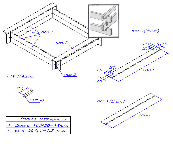 Итак, начнём обустраивать детскую площадку с первого, одного из простых, элемента - песочницы. После того, как определились с местом, начинаем подготовку участка. Под детской песочницей закладываем дренаж из щебня, предварительно удалив дёрн и часть почвы для того, чтобы воде было легко уйти и песок мог быстро просохнуть после дождя. Материал (доски, бруски) для песочницы должен использоваться гладко обработанный, чтобы ребёнок не нахватал заноз. Нам потребуется десять 150 мм досок обрезных, толщиной 20 мм и длинной 1.8 метра. Стенки песочницы будут состоять из двух таких досок и составлять 30 см. Таким образом нам потребуется 8 досок. По краям этих досок выпиливаем пазы, в которые будут вставляться доски при сборке. Для закрепления всей конструкции - по торцам устанавливаем бруски 50х50 (см. схему выше). И в завершении на стенки крепим две доски (а можно и все четыре), которые будут играть роль скамеек. На этих скамейках ребёнок сможет и сидеть и лепить куличики. Если у Вас есть