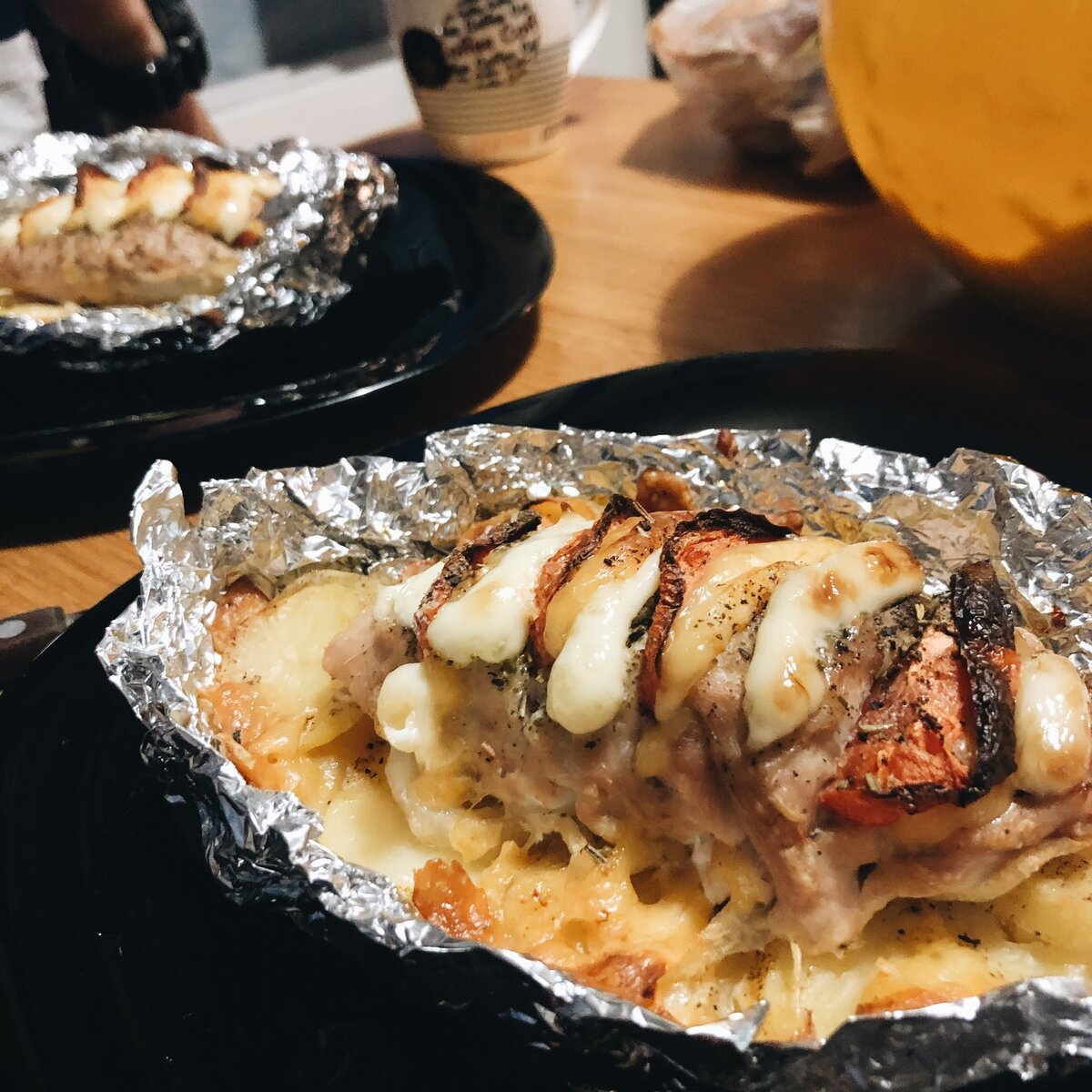 ИНГРЕДИЕНТЫ: Куриное филе, помидор, сыр, картофель ,лук , специи по вкусу Промываем филе, чистим картофель, моем помидор. Из фольги делаем лодочки, смазываем маслом Нарезаем колечками картофель и лук. Кладём сначала картофель, сверху добавляем специи, затем лук. Делаем надрезы в филе. В них кладём нарезанный сыр и помидор. Приправляем (я добавила ещё майонез сверху). Запекать примерно минут 45 в заранее разогретой до 180 градусов духовке. Приятного аппетита!