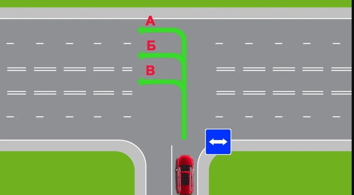 Уверены ли Вы, что с отличием знаете правила дорожного движения? Да?! Тогда проверим это в нашей сегодняшней задачке, подготовленной специально для Вас. Внимательно рассмотрите картинку ниже и ответьте на вопрос: По какой из указанных траекторий может продолжить движение автомобиль? (Может быть несколько вариантов ответа) Варианты ответа: 1. Только по траектории "А",