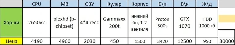 Сборка №2 — 30.000 руб 30 тысяч — уже неплохая сумма. Раньше, за этот бюджет, мы могли себе позволить процессор уровня i5-6400 и видеокарты GTX 1050ti, но такой конфиг — удел раскрывателей, так что мы соберём что-то куда производительней. Выбор уже из 3 вариантов: райзен, интел кор и зионы. В бюджетном сегменте брать интел выгодно лишь на б\у, и то редко, а новые стоит рассматривать на зарубежных интернет-магазинах. Райзен конечно же можно взять, но тогда мы просядем по бюджету из-за всё ещё дорогой (относительно регистровой ддр3) ддр4 памяти и материнской платы, вы всё ещё надеетесь взять ширпотреб на B350/B450 и о апгрейте на топовые райзены зен2? Отложим мечты представителей красного лагеря для другой статьи. И так, у нас остался зион, у которого, как ни странно, не отваливается кеш и не выгорают ядра. Я сильно удивился итоговой сборке, так как мы смогли взять хороший блок питания от чифтека, видеокарту 1070, 16-ти поточный камень, с частотой до 3.1 ГГц, и даже немного доплатили з