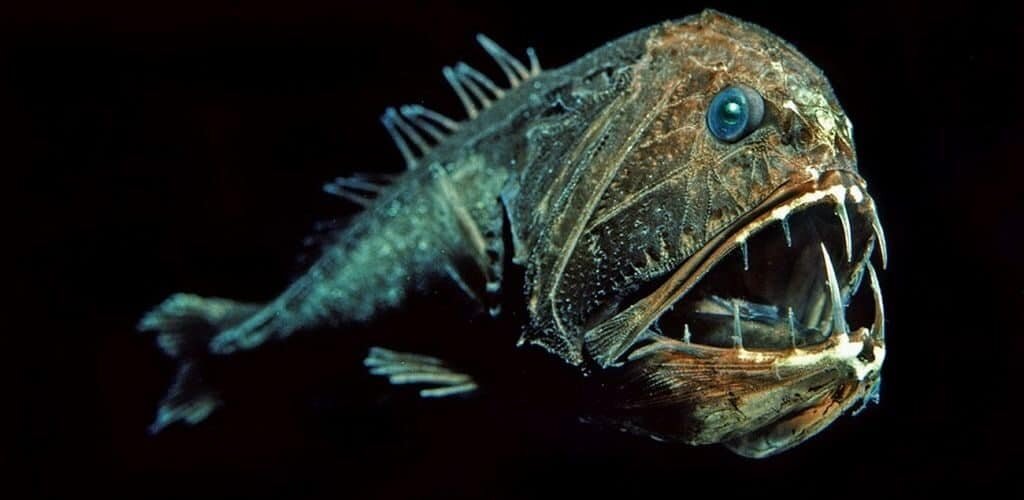 Глубоководная рыба саблезуб или "рыба-людоед" считается самой страшной в мире из-за своих устрашающих зубов. Шар с выпученными глазами и огромной пастью с редкими длинными острыми зубами напугает даже самого отважного ныряльщика.