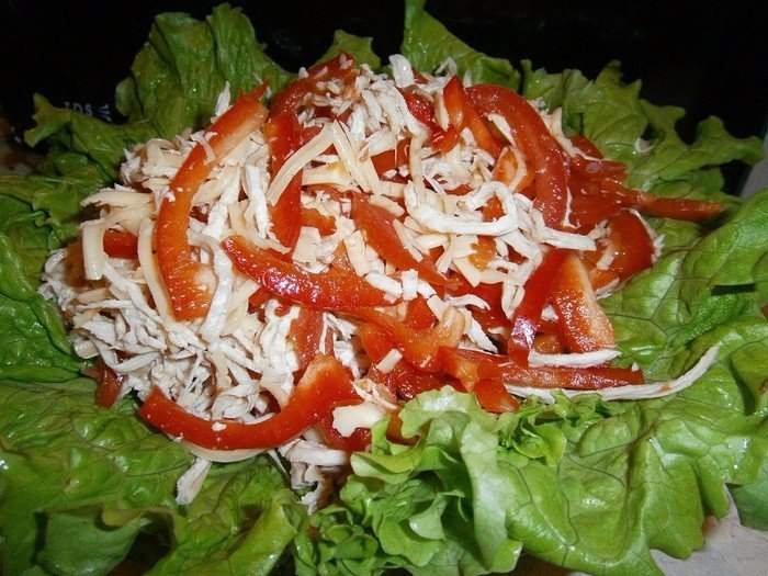 Ингредиенты:Курица (лучше грудка, отварная) — 400 гПомидор (свежий) — 400 гКартофель (отварной) — 400 гПерец болгарский (яркий, лучше красного цвета) — 300 гСыр твердый — 250 гМасло оливковое (можно любое нерафинированное растительное)Сок лимонныйСпеции (соль, перец - по вкусу)ПРИГОТОВЛЕНИЕ:Куриное мясо разбираем на волокна.Картофель режем некрупноСыр трем на терке среднего размераПерец режем тонкими полоскамиПомидоры режем небольшими кусочкамиСмешиваем все продукты, заправляем смесью: оливковое масло + лимонный сок + соль + черный молотый перец.Салат готов. В журнале рекомендовали подавать его на салатных листьях.