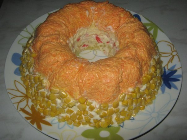 Дать постоять 3-4 часа,а потом переворачиваем на плоское блюдо и украшаем кукурузой)).