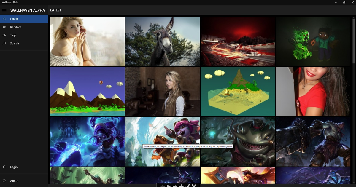 Wallhaven.cc(alfa) Приложение позволяет легко и быстро просматривать обои на ваш вкус и цвет. Так же есть поиск по тегам и описанию и можно фильтровать результаты по разрешению и соотношению сторон, сортировать по дате, количеству просмотров. Понравившиеся обои можно установить на рабочий стол или сохранить на диске. Имеется в арсенале Wallhaven Alpha и функция автоматического скачивания, установки и замены фона рабочего стола и экрана блокировки через заданный промежуток времени. Причём обои будут отбираться по нужному пользователю запросу, из выбранных им категорий.Так же Wallhaven Alpha позволяет выбрать одну из двух доступных тем оформления: светлую или тёмную. Программу можно скачать тут!!)