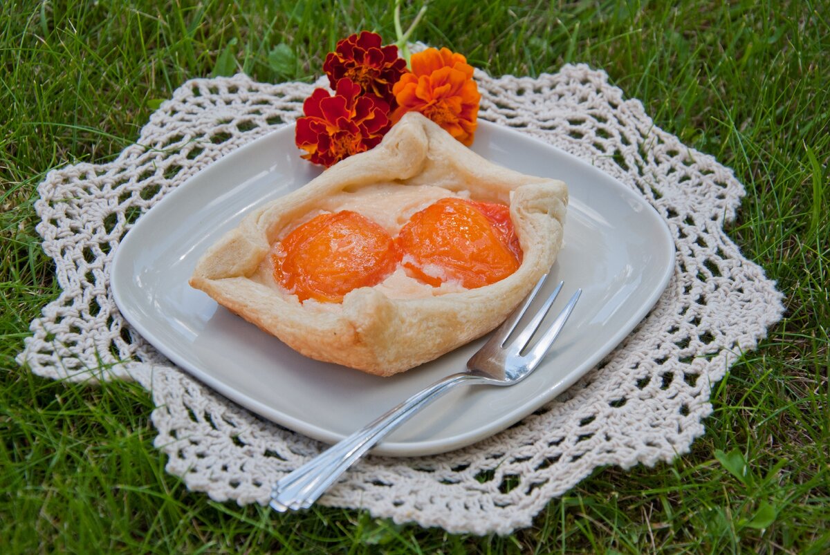На тесто выложить 1 ст. л. крема, сверху выложить по 2 половинке абрикоса, края теста подогнуть (можно смазать белком, оставшимся от крема). Выпекать при 180ºС 30-35 минут. Вкусно и в теплом,