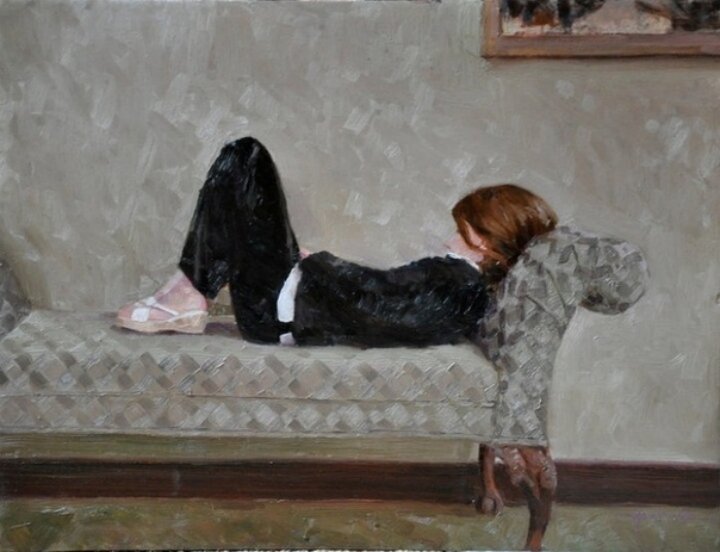 Художник не перестает удивлять нас загадочными реминисценциями, концептуально в его творчестве прослеживается композиционная неопределенность сюжета, подталкивающая нас к размышлениям. На этот раз перед нами предстает комната в невыразительных тонах, на кушетке мы видим женскую фигуру, трудно определить, девушка это или девочка, бодрствует она или спит, но ее безвольная неподвижная фигура выражает глубокую меланхолию, которую подчеркивают преобладающие серые тона, черный костюм и узкая белая полоска ремня на талии, как бы удерживающую ее на связи со светом, ноги полусогнуты и подтянуты к животу, символизируя желание защититься от чего-то, на ногах туфли, лицо полускрыто и опущено к груди, все говорит о том, что в душе подростка глубокая апатия, фрагмент рамы картины без самого полотна справа наверху подчеркивает мертвенность интерьера, как и цвет ступней(ранее уже апробированный художником прием), и здесь пугающую статичность комнатного пейзажа подчеркивает спинка кушетки, в которой угадывается неживой человеческий абрис, некое материально олицетворенное также безвольно поникшее альтер-эго героини сюжета, а из угла кушетки видна как бы выбирающаяся изнутри наружу фигурка мыши или крысы, или каких-то подобных им злобных существ, вероятно, художник хотел подчеркнуть картину внутреннего душевного распада; тишина, некроз души, безразличие...