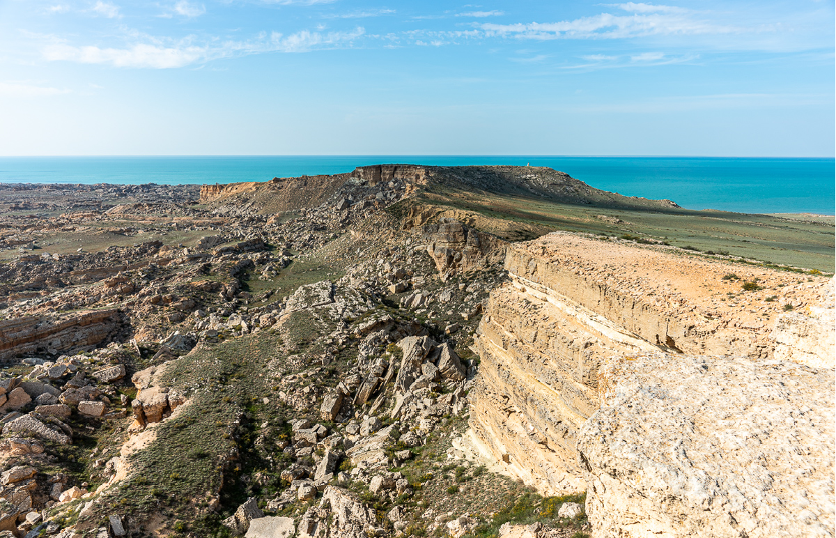 Степь резко обрывается отвесными скалами, а на дне хаотично разбросаны огромные обломки породы - известняковой плиты толщиной 30 - 35 метров, формирующей поверхность Тупкараганского плато.