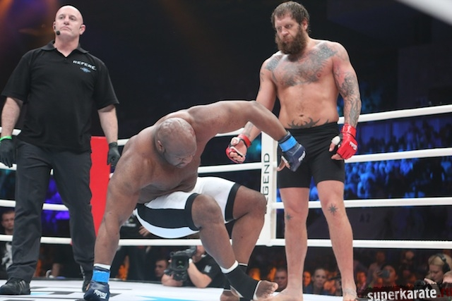 Затем Сапп падает на пол, а Емельяненко начинает добивать своего оппонента. Бобу не остается ничего делать, кроме ка