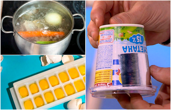 Чтобы в муке не завелись насекомые, пересыпьте ее в пластиковый или металлический контейнер и храните вместе с одним или двумя лавровыми листками. Сушеный лавр своим запахом отпугнет вредителей. 2. Открытые молочные продукты имеют свойство быстро портиться. Просто переверните контейнеры так, чтобы крышки оказались внизу, и в таком виде поставьте в холодильник. Таким образом вы создадите в упаковках вакуум, который не позволит микроорганизмам проникнуть внутрь. 3. Хранение яиц Если вы случайно разбили яйцо и не можете его сразу приготовить, перелейте субстанцию в форму для льда, добавьте капельку соли и сахара и отправьте в морозилку. Приправы помогут сохранить есте