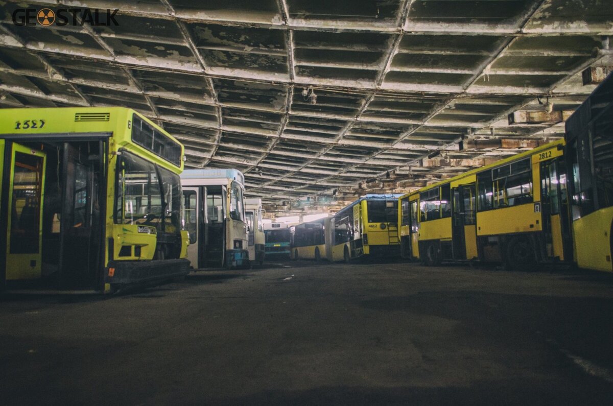 Огромный гараж Седьмого автобусного парка города Киева рассчитан на триста машин, но сейчас здесь стоят лишь несколько десятков списанных автобусов. Фотограф Александр Дягтерёв опубликовал снимки старых автобусов, стоящих в гараже одного из автобусных парков города Киева. Гараж седьмого автобусного парка Киева построили в 1973 году. Огромный круглый «шатёр» диаметром 160 метров имеет уникальную конструкцию: между стенами и центральной башней-опорой натянуты тросы, на которых закреплены бетонные плиты купола. Сейчас круглый гараж находится в аварийном состоянии, и под куполом стоят только аварийные автобусы, рабочая техника хранится на открытой стоянке. Когда-то седьмой автобусный парк Киева обслуживал множество городских, пригородных междугородных маршрутов, но в последние годы маршрутная сеть сильно сократилась. Среди списанных автобусов преобладают белорусские МАЗы, а также украинские ЛАЗы и «Богданы». Можно встретить здесь и старые машины европейских марок. Некоторые автобусы наход