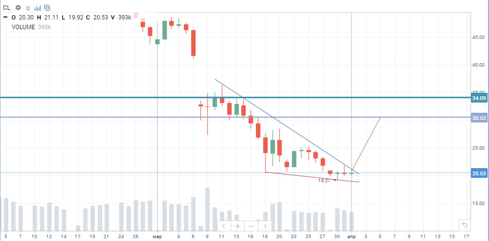 Нефть двигается в нисходящем клине. Отработка фигуры - это движение к ее основанию. Смотрю марку WTI. По волнам Эллиота также должна начаться 4-я волна, движение наверх зигзагом. Цель для WTI 30,5$ минимум, максимум 34$. По брент 34$, 38$ соответственно. Клин уже пробили наверх. Во флэте 20-21$ был набор позиции. Наш рынок пойдет вверх вслед за нефтью. Я по крайней мере на это надеюсь. Помешать росту могут снижающиеся индексы Америки и Европы. Вообщем по теханализу наш рынок настроен на продолжение роста в коррекционной волне. Цель по индексу Мосбиржи 2613 пунктов. Купил на весь депозит акции Татнефть ап. в спекулятивных целях. Бумага ходит размашисто, можно взять хороший плюс. Цель по бумаге 590 рублей. Не является индивидуальной инвестиционной рекомендацией. Автор не несет ответственности за возможные убытки в случае совершения операций либо инвестирования в финансовые инструменты, упомянутые в публикациях.