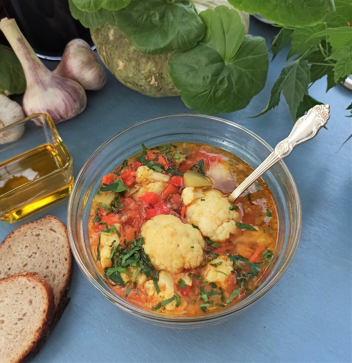 Сейчас уйма статей о том, что есть, чтобы укрепить здоровье и о том, что поможет уберечься от вируса. Много пишут о полезных свойствах куркумы, она и укрепляет иммунитет и помогает при болезнях желудка, облегчает депрессию и так далее. Я давно использую куркуму в разных блюдах. А цветную капусту я стала часто готовить, когда моей дочке в три годика прописали диету. Она легче усваивается, в ней меньше клетчатки, чем в белокочанной, много витаминов и микроэлементов. Этот овощной супчик из цветной капусты с куркумой и зеленью будет полезен в любое время года. Мне нравится есть суп с чесноком и нерафинированным растительным маслом, хорошо что и муж тоже так любит! Ингредиенты: Приготовление: Овощи и петрушку помыть, у кинзы оторвать корешки и замочить в воде. Почистить лук, картофель и морковь. Налить в большую кастрюлю 2,5 литра воды и нагреть до кипения. Пока вода нагревается, разрезать вдоль пополам - 1 луковицу, 1 морковку, от цветной капусты отрезать нижнюю жесткую часть, до соцве