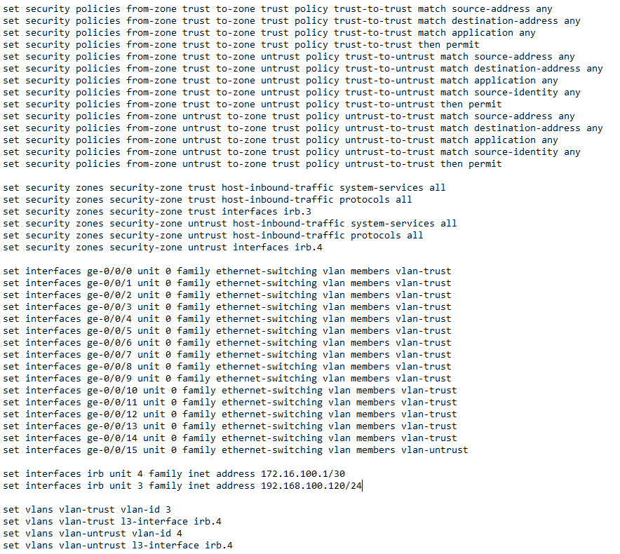 Первоначальная настройка представляет: В нашем случае мы будем использовать названия VLAN's: Название для зон безопасности и VLAN могут быть любыми. vlan-trust: root@juniper# set vlans vlan-trust vlan-id 3 root@juniper# set vlans vlan-trust l3-interface irb.3 root@juniper# set interfaces irb unit 0 family inet address 192.168.100.1/24 vlan-untrust: root@juniper# set vlans vlan-untrust vlan-id 4 root@juniper# set vlans vlan-untrust l3-interface irb.4 root@juniper# set interfaces irb unit 0 family inet address 172.16.100.1/30 Разрешаем все сервисы в зоне trust: root@juniper# set security zones security-zone trust host-inbound-traffic system-services all Разрешаем все протоколы в зоне trust: root@juniper# set security zones security-zone trust host-inbound-traffic protocols all Добавляем интерфейсы в зону trust: root@juniper# set security zones security-zone trust interfaces irb.3 Аналогично проделываем для зоны untrust: root@juniper# set security zones security-zone trust host-inboun