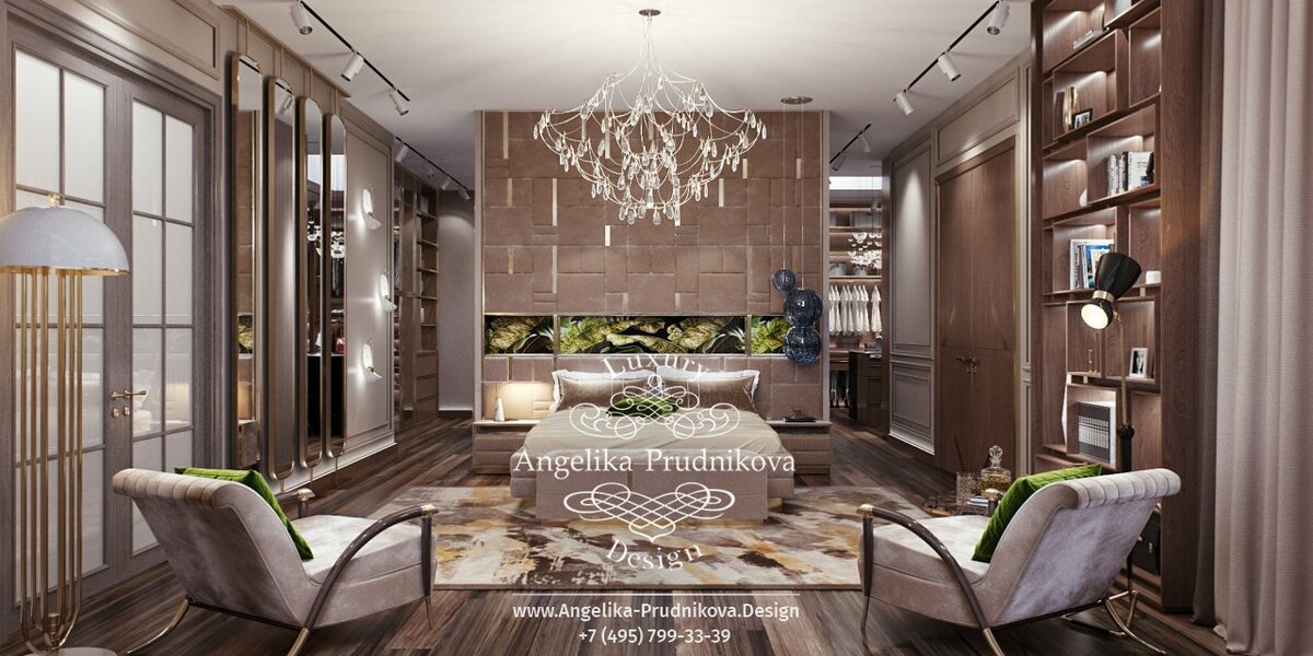 Центральное место в комнате занимает зона сна, которая обозначена большим ковром и отгорожена от гардеробной высокой перегородкой. Со стороны спальни авторы проекта оформили перегородку декоративным панно с необычной раскладкой. Оно составлено из небольших модулей, обитых велюром, и играет роль мягкого изголовья. А прямо над кроватью в него интегрирован линейный фитомодуль. Напротив кровати расположилась зона для отдыха и чтения с парой удобных современных кресел, торшером и книжным стеллажом. А за перегородкой – вместительная гардеробная с открытыми системами хранения и трековым освещением, которое органично «перешло» и в спальню, составив «компанию» дизай