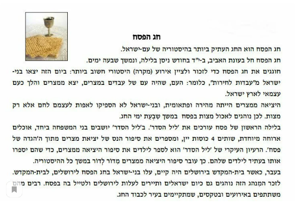 Прочитать перевод Прослушать текст на иврите Привожу в этой публикации, на мой взгляд, наиболее важные словосочетания и лексические единицы) Итак, слово חג (хаг) известно, наверное, всем и означает праздник. Выражение העתיק ביותר hатик бэйотер означает превосходную степень и переводится как "самый древний". Сезон весны בעונת האביב читается как бэонат hаавив (смихут) Буквенное значение 14 ב-י"ד Песах, как известно, празднуется 14 нисана. Продолжается נמשך (нимшах). Если мне не изменяет память, от этого корня מ-ש-ך происходит имя Моше, которое дала дочь фараона Батья, спасенному ей младенцу. Именно ему в будущем суждено было вывести евреев из Египта. Семь - количественное числительное в мужском роде. שִבעָה (шивъа). Употребляеется, потому что слово "день" в иврите имеет мужской род. Известно также как название 7 дней траура. Глагол לציין имеет значение "отмечать", "обозначать". Относится к биньяну пиель. Событие, случай звучит как אֵירוּעַ (эйруа). Интересно, что в