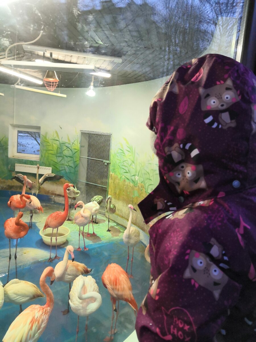 ЗООПАРК 2 Вчера мы с вами остановились прямо при входе в зоопарк. Предвкушая встречу с животными из разных стран и континентов, мы нашим дружным отрядом ввалились на территорию. И…. И ничего! Напомню, что тогда было 30 декабря, смеркалось и снег решил наконец обелить все вокруг, животных нет ни справа, ни слева, ни спереди, а за спиной у нас только кассы и дружелюбный аниматор в костюме панды,ну как бы не за этим ехали. Мы решили не падать духом и пошли вдоль центрального пруда, где к нашей радости обнаружился довольно большой птичник. Собрали все свои знания по орнитологии в кучку, надо сказать, в небольшую кучку, дополнили их информацией с табличек, которые развешаны вокруг. Не ударили в грязь лицом перед ребенком, объяснили разницу между гусем и уткой. Через пару метров наткнулись на помещение со стеклянной стенкой, где жались друг к другу розовые фламинго, они стояли по колено (если у них есть колени) в воде и их потряхивало, прилично так потряхивало. Они были как прекрасные