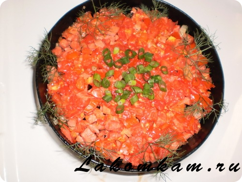 Закуска жареная колбаса «Чудесная». Ингредиенты: пол килограмма варёной колбасы; пол килограмма помидоров; 1 средняя луковица; соль по вкусу; растительное масло.