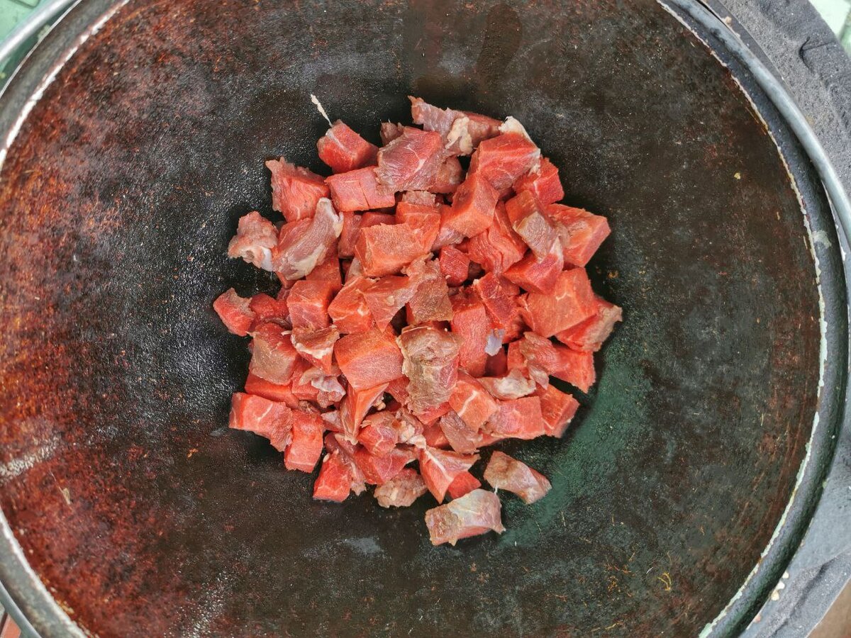 Прокаливаем казан, обжариваем целую луковицу, достаём её влив в него растительное масло и выкладываем куски нарезанного мяса.