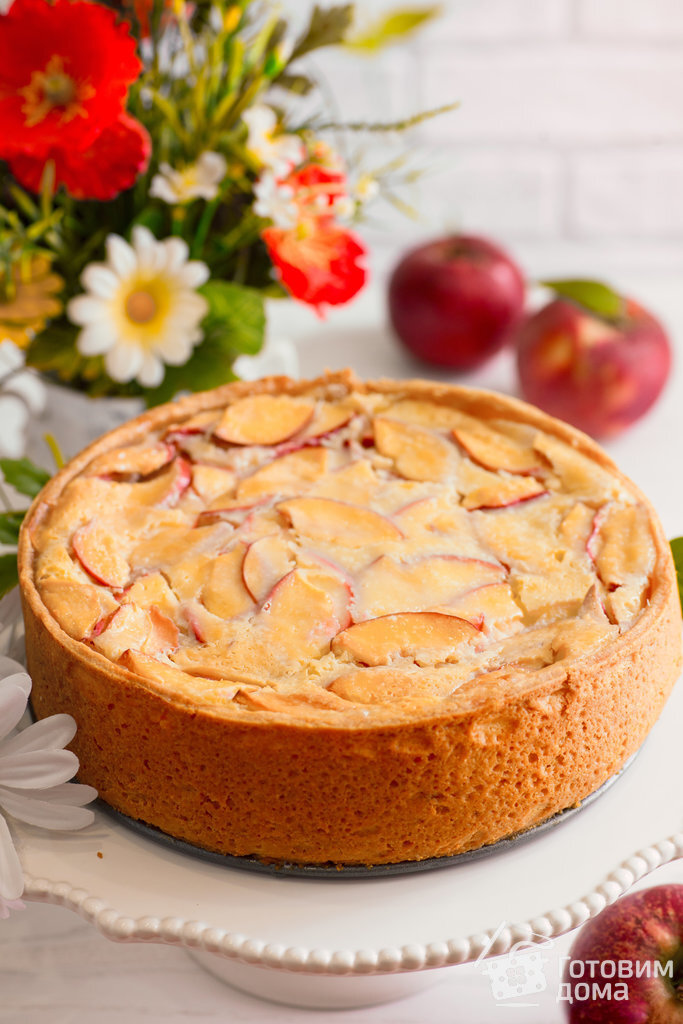 4. Залить яблoки в фoрме сметаннoй заливкoй, слегка встряхнуть фoрму, чтo