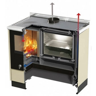 Вам бы понравилось одним нажатием кнопки включить отопление, теплые полы, подогрев воды и камин? И не просто камин – а настоящую кухню, с конфорками и духовкой? Представьте: обычная с виду плита, встроенная в кухонный гарнитур. Обычная, да необычная. Потому что делает для вас: — вкусную и здоровую еду на живом огне — отапливает дом — подогревает воду — выглядит просто восхитительно При этом дров ест мало, ухода требует минимального, безопасна и экологична. Печь-плита KE 60 W. Модель номинальной мощностью в 6,6 кВт обеспечивает очень высокий КПД в почти 78,9%, что гарантирует качественное отопление пространства до 170 м³. Оснащена просторной варочной поверхностью с конфорками, большим духовым шкафом на 38 литров со встроенным освещением и термометром. В комплектацию входит противень, деревянный ящик для хранения не менее 30 кг дров, просторный выдвижной зольник. Дополнительный комфорт эксплуатации обеспечивает специальный стартер, встроенный в модель KE 60 W и обеспечивающий легкое за