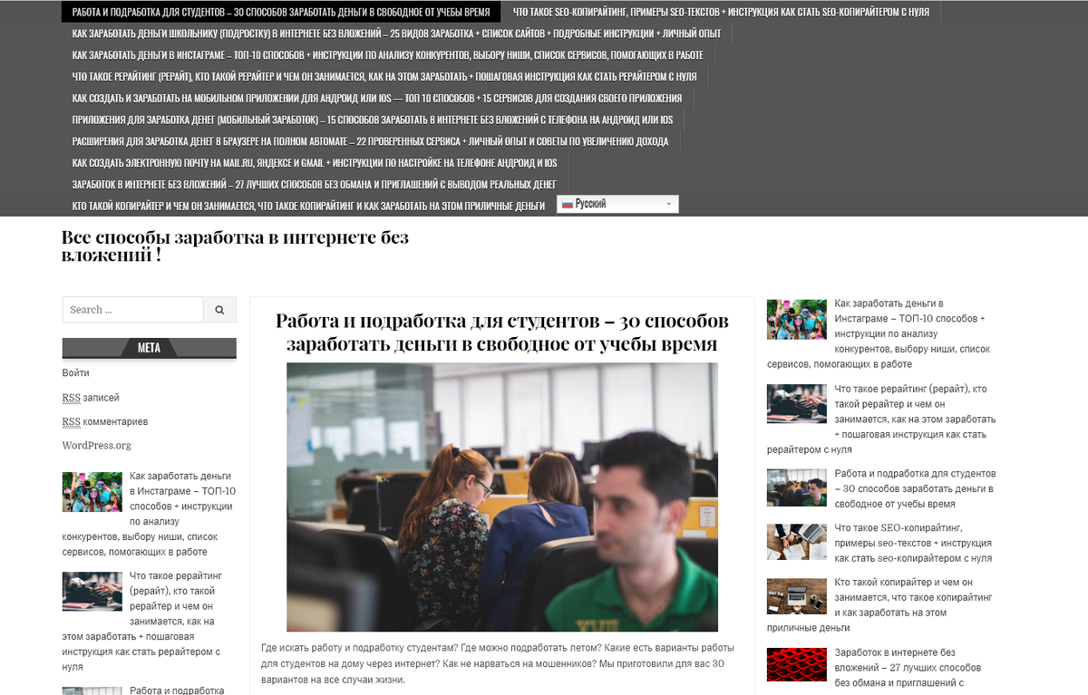 Всем привет, в это не простое время когда нужно находится дома у многих может возникнуть вопрос чем еще себя занять? Хочу предложить сайт в котором описаны все известные способы заработка в интернете БЕЗ ВЛОЖЕНИЙ! Кому и чем он будет полезен? Во- первых кто-то сможет прокачать свою интернет грамотность и чему то научится , во-вторых ,возможно кто-то сможет найти действительно рабочий способ дополнительного дохода и развить его. Что же из себя представляет ресурс. Это полноценный сайт , даже можно сказать где-то учебное пособие. Написано ряд статей по самым доступным и востребованным направлениям интерент-ресурсов для заработка, поехали 1.Работа и подработка для студентов рассказывается как и где можно найти подработку, какая она бывает описаны плюсы и минусы, на что нужно обратить внимание и чего опасаться, помним о том, что временно нужно воздержаться от выхода на улицу 2. Что такое SEO-копирайтинг, примеры seo-текстов + инструкция как стать seo-копирайтером с нуля современные тенде