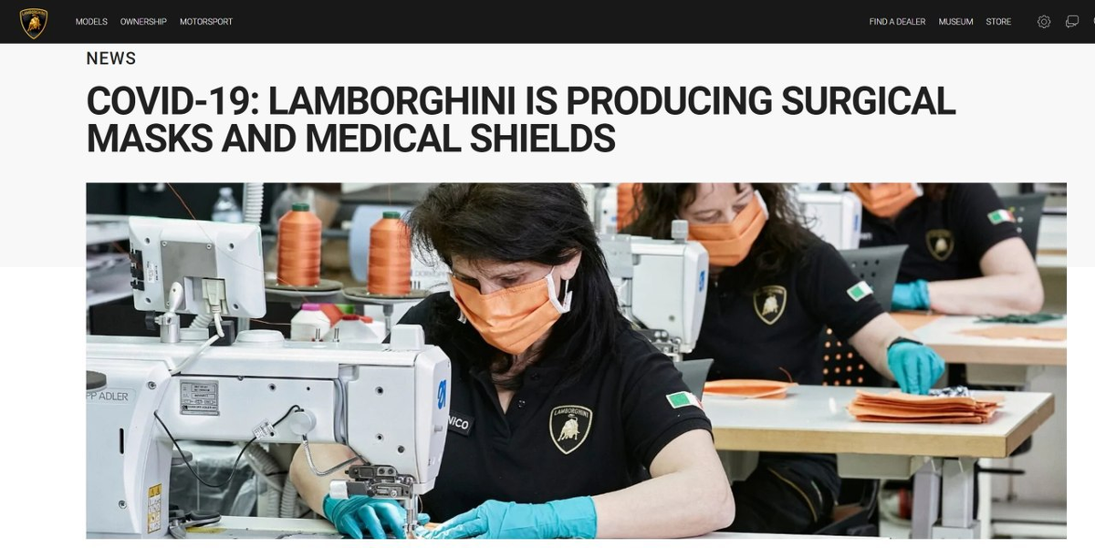 Дожили, уже даже производитель спорт-каров Lamborghini переводит часть производства на пошив медицинских масок и защитных лицевых экранов.