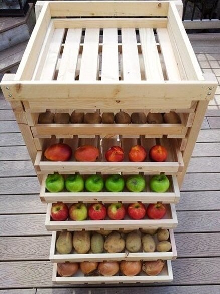 В деревянном стеллаже с выдвижными ящиками в несколько рядов очень удобно и экологично хранить и сушить урожай. Овощи и фрукты здесь хорошо проветриваются и не соприкасаются с искусственными материалами - пластиком и полиэтиленом, что способствует их длительной сохранности в первозданном виде. При этом конструкция легка в исполнении, не займет много места и даже украсит вашу дачу.