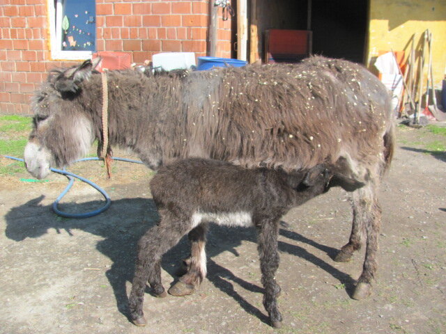 Всем доброго времени суток!!! Сегодня хочу продолжить рассказ про Эшли и её малыша!!! Когда малыш появился на свет, мы стали думать, как его назвать. Ослёнок родился шоколадного цвета и мы подумав, решили назвать его Мавром, а ласково Мавриком. Маврик, как и все малыши, был очарователен. Первые несколько дней он старался не отходить от мамы, держался рядышком, изучал площадку приюта и её обитателей со стороны. Эшли тоже постоянно держала его под контролем, стоило ослёнку сделать шаг вправо или влево от неё, она сразу поворачивалась и смотрела, не угрожает ли опасность её дитёнку. Примерно через неделю после рождения, Маврик совершенно освоился в новом для него мире, и начал вести себя как маленький, игривый хулиган. На копытках он уже стоял уверенно и ему очень хотелось бегать и играть, но для этого нужно было получить разрешение от строгой мамы Эшли, которая с опаской относилась к играм сына и старалась быть всегда рядом. Когда по утрам мы открывали двери в их стойло, то Маврик сразу