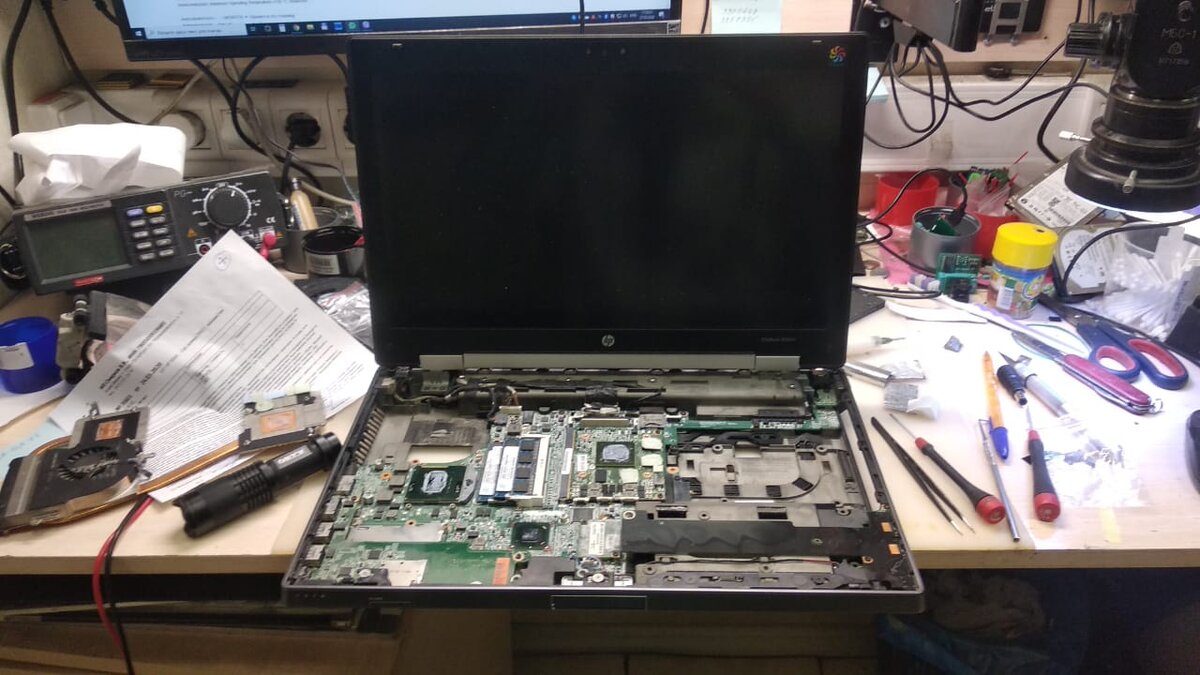 Ремонт ноутбука HP EliteBook 8560w Ноутбук принесли в ремонт с жалобой на то что он не включается. Причем не только не включается, но и индикации зарядки аккумулятора тоже нет. Какие то проблемы по входной цепи питания. Подключили свое зарядное устройство - та же картина. Придется разбирать ноут. Хотели проверить разъем питания для начала, но после разборки визуально определили проблему. Сгорел входной ключ питания, причем так, что прожег дыру в плате и выгорели подходящие к нему дорожки. Прикольно. Микросхему сняли, прогар зачистили чтобы убрать короткое замыкание, дорожки восстановили, новую микросхему на место поставили. Надо попробовать запустить, так как часто при прогарах платы возникает короткое замыкание между слоями в текстолите платы и такую материнскую плату уже не отремонтировать. Подсобрали ноут, стартанули - есть старт, на экране ноутбука появилось изображение. Ноутбук собрали, протестировали и выдали владельцу. Ремонт ноутбука HP EliteBook 8560w выполнен.