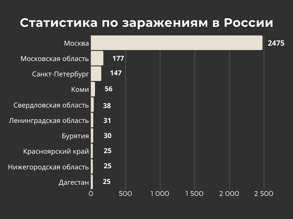 Здравствуйте, друзья. Продолжаем следить за развитием событий, связанных с распространением вируса Covid-19 в России и мире. Статистика по случаям заражения в России По данным на 2 апреля в нашей стране зарегистрировано 3 548 случаев заражения коронавирусной инфекцией. Первые десять субъектов РФ по числу зараженных: По сравнению со вчерашним днем в 10-ку регионов по числу заболевших вошли два новых субъекта: Нижегородская область (+13) и Республика Дагестан (+10). Больше всего новых фактов заражения установлено в Москве (+595), Московской области (+43), Санкт-Петербурге (+22). Статистика по летальным исходам в России По данным на 2 апреля в России подтверждено 30 (+6) летальных исходов от коронавирусной инфекции Мировая статистика По последней информации в мире выявлено 940 105 зараженных. Погибло 47 323 человека, выздоровело 195 416 пациентов. Оставайтесь с нами, мы продолжаем следить за ситуацией в России и мире. Понравилась статья? Поддержите нас