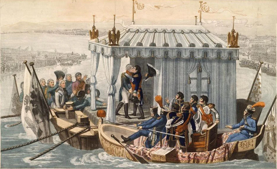 Русско-французские переговоры проходили в несколько этапов. 21 июня 1807 года было подписано перемирие, ратифицированное Александром 23 июня. 25 июня (7 июля) 1807 года на р. Неман на плоту состоялось знаменитая встреча императоров, целью которого было подписание мирного договора. Позиция Александра I заключалась в следующем: отказ России от союза с Великобританией, произошедших в Европе в период наполеоновских войн. Российский император добивался невмешательства Наполеона в русско-османские отношения и сохранения территориальной целостности Пруссии во главе с Фридрихом Вильгельмом III. Целью Наполеона было добиться установления союзных отношений с Россией, которые были необходимы французскому императору для завершения своих завоеваний на Пиренейском полуострове и для успешной борьбы с Великобританией. В результате напряженных переговоров в Тильзите было подписано два документа: мирный договор и секретный союзный договор. По условиям мирного договора Россия соглашалась на отторжение