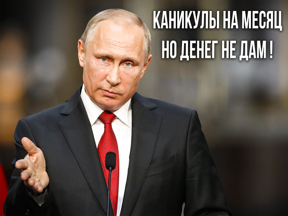 Буквально несколько минут назад, в прямом эфире на государственных телеканалах выступил c речью Владимир Путин. Он сказал, что режим самоизоляции продлён до конца апреля, то есть ещё на целый месяц. Многие люди ждали от президента денежный аирдроп (как в США), ведь как можно не ходить на работу и сидеть дома, а жрать что простите? Но увы, денег нет, держитесь там...