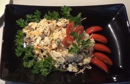 Сегодня хочу поделиться с вами очень вкусным салатом ,который готовятся очень просто и быстро. Называется он восхитительный. Также салат очень малокалорийные. Какие ингредиенты понадобятся для салата. капуста свежая сто грамм, морковка, куриная грудка сто грамм, лимон, зелень петрушки, три помидора свежих для украшения, небольшую горсть сладкого изюма. Майонез. Приступаем к приготовлению салата. Куриную грудку необходимо мелко нарезать кубиками. Далее изюм замочить в теплой воде. Морковь необходимо натереть на тёрке для корейской моркови. Из лимона необходимо выдавить сок, нам понадобится примерно чайная ложка. Капусту и петрушку необходимо мелко нашинковать. Капусту необходимо будет влить лимонный сок и хорошенько всё перемешать, а затем соединить с петрушкой. Необходимо капусту размять руками Нам понадобится глубокий салатник, в него выкладываем изюм, куриную грудку, капусту подготовленную с петрушкой и лимоном, далее морковку и майонез. Тщательно все переме