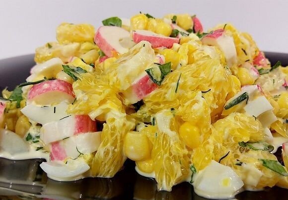 Чтобы приготовить такой вкусный салатик, нам понадобятся следующие ингредиенты: Также можно добавить сухарики. Способ приготовления: Сначала отвариваем наши яйца. После этого очищаем скорлупу от яиц и нарезаем. Открываем кукурузу и высыпаем в тарелку. Далее нарезаем кубиками крабовые палочки и добавляем майонез с чесноком. Вот и весь рецепт. Приятного аппетита!