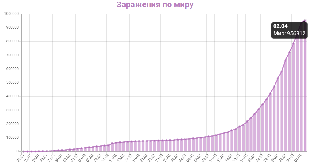 Учитывая сегодняшнюю статистику... А это почти 1 миллион заражений за все время!! И из них 203 тысячи выздоровлений и 48 тысяч летальных исходов! Статистика не утешительна, а если учитывать что пик распространения будет на конец апреля начало мая, то если каждый день будет прибавляться по 70.000 тысяч то к концу апреля <<70 000 × 28 = 1 .960 .000 + 950 .000 = 2. 910. 000 >> зараженных! Но ведь растет не определенный, сегодня 70.000 тысяч завтра 100.000 после завтра 150.000!! Примерно сделал грубый расчет прогноза учитывая данные сегодняшнего дня <02.04.20>, к концу апреля достигнет 15 миллионов зараженных!!! а это только грубый прогноз ведь возможно и больше и меньше! P.S. не стоит учитывать в серьез это всего лишь математика!