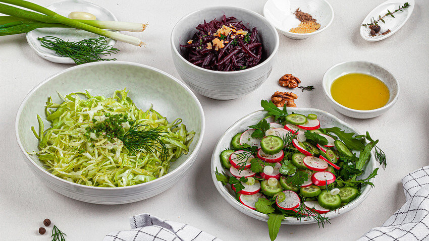 Вы можете подумать, что легкая пища не является нашей сильной стороной, но не забывайте, что русские часто употребляли вегетарианские блюда из-за церковных правил, которые призывали верующих поститься около 200 дней в году. Русские начали делать салаты только в 19 веке. По словам эксперта по истории русской кухни Уильяма Похлебкина, пищевые тренды часто приходили из Европы. В те дни салаты состояли только из одного вида овощей: был салат из свеклы, картофельный салат и салат из капусты. Можно сказать, что они довольно скучны, но другие могут рассматривать это как минималистичный подход, который позволяет нам испытать чистый вкус ингредиента. Тем не менее, следующие салаты обещают быть интригующими. 1. Салат из сладкой свеклы с хрустящими орехами и травами Красная свекла - один из самых традиционных российских овощей, и ее обычно пекли в духовке или тушили, а подавали целиком. Давайте сделаем салат из свеклы, но сделаем это блюдо ближе к современным традициям. Ингредиенты: