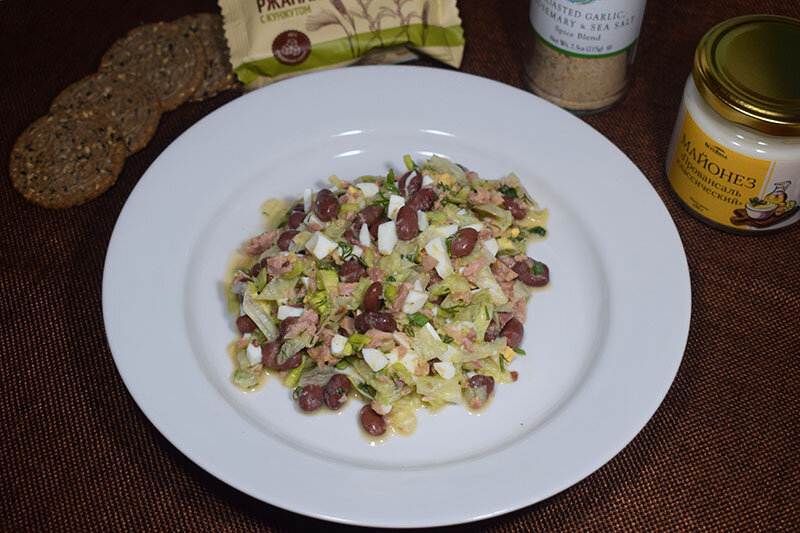 Примерное КБЖУ на 100 грамм блюда: Б - 11 г; Ж - 2,1 г; У - 4,7 г; 81,9 Ккал. Ингредиенты: - консервированный тунец - 170 г; - красная консервированная фасоль - 150 г; - куриные яйца C1 - 2 шт; - салат Айсберг - 100 г; - лук порей - 20 г; - зелёный лук - 15 г; - свежий укроп - 10 г; - гранулированный чеснок по вкусу; - соль по вкусу. Способ приготовления: Подготавливаем ингредиенты