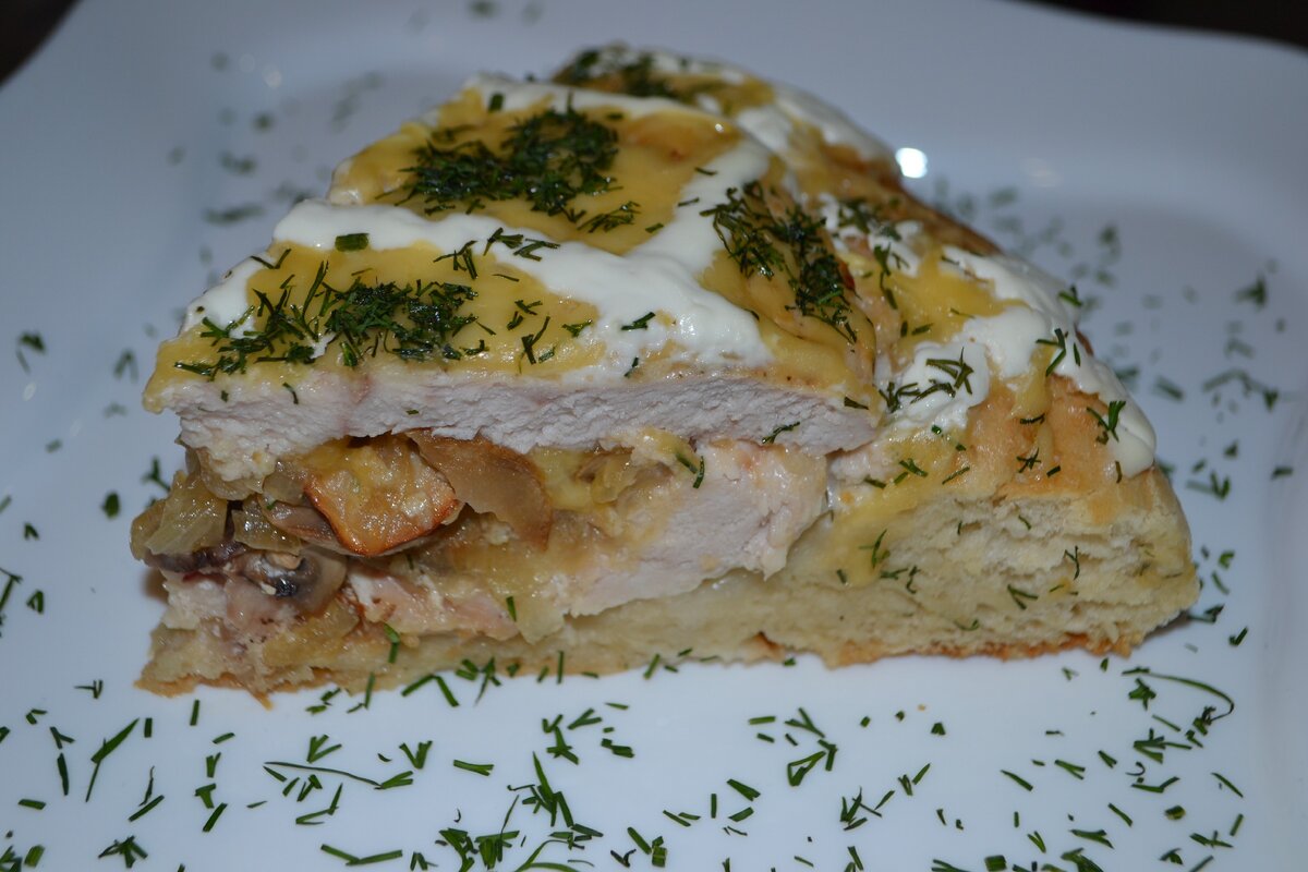 Ооочень вкусный лаваш с начинкой из курицы и грибов готов, разрезаю на порционные кусочки, подаю к столу.